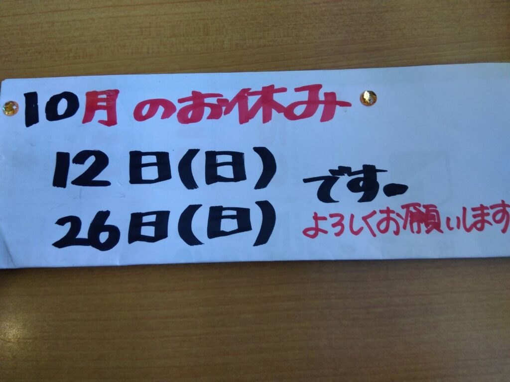 【2025年】10月のお休みについて 2025年10月5日 お知らせ コメント 2025年10月の全休日は、10月12日(日)10月26日(日) となります。 ご理解のほど、よろしくお願いいたします。 【2025年】9月のお休みについて コメントを残す コメントをキャンセルメールアドレスが公開されることはありません。 ※ が付いている欄は必須項目ですコメント ※ 名前 ※ メール ※ サイト 次回のコメントで使用するためブラウザーに自分の名前、メールアドレス、サイトを保存する。 上に表示された文字を入力してください。