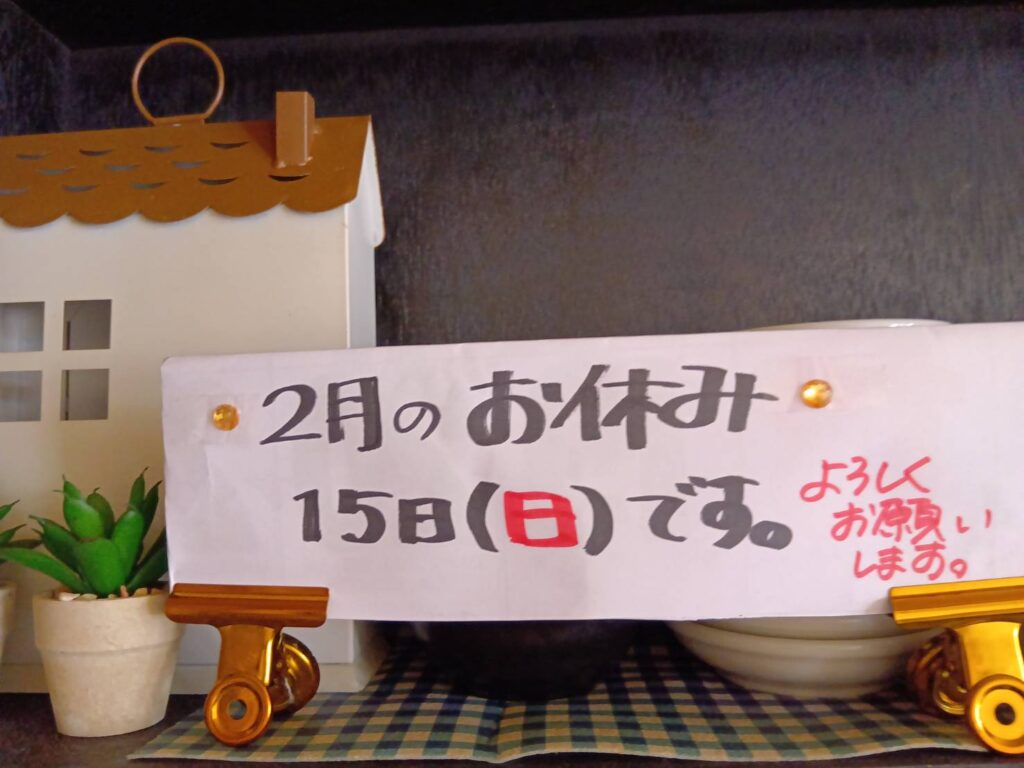 【2026年】2月のお休みについて 2026年2月5日 お知らせ コメント 2026年2月の全休日は、2月15日(日) となります。 ご理解のほど、よろしくお願いいたします。 【2026年】1月のお休みについて コメントを残す コメントをキャンセルメールアドレスが公開されることはありません。 ※ が付いている欄は必須項目ですコメント ※ 名前 ※ メール ※ サイト 次回のコメントで使用するためブラウザーに自分の名前、メールアドレス、サイトを保存する。 上に表示された文字を入力してください。